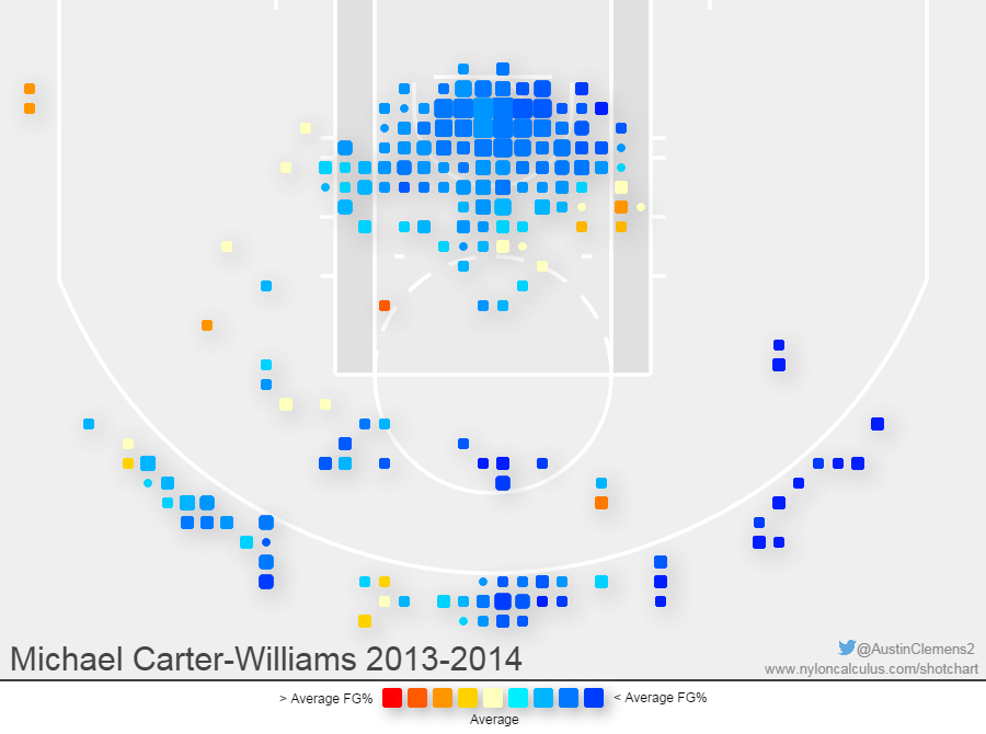 Outside of a couple of veterans like Shved, Mbah a Moute, and Jason Richardson, who sat out last season after knee surgery, the roster is basically free for Noel and reigning-Rookie of the Year Michael Carter-Williams to play as many minutes and get up as many shots as they are physically able. Carter-Williams, the #11 pick in last year’s draft, played 70 games and averaged 16.7 PPG, 6.2 RPG, 6.3 APG, 1.9 steals and 3.5 turnovers per game on 40.5% from the field and 26.4% on 3-pointers. He had moments, especially early in the season, where he was adept at running head coach Brett Brown’s wide-open, fast-break offense, dropping a 22/7/12/9 steals in his first game of the season, a victory at home against the champion-Miami Heat. His best months were over the six games he played in December, where he averaged 19.3 points with 8.2 assists per game on 44.9%, and in the eight games to end the season in April, with 17.6 points on 52.5% and 42.8% from 3.