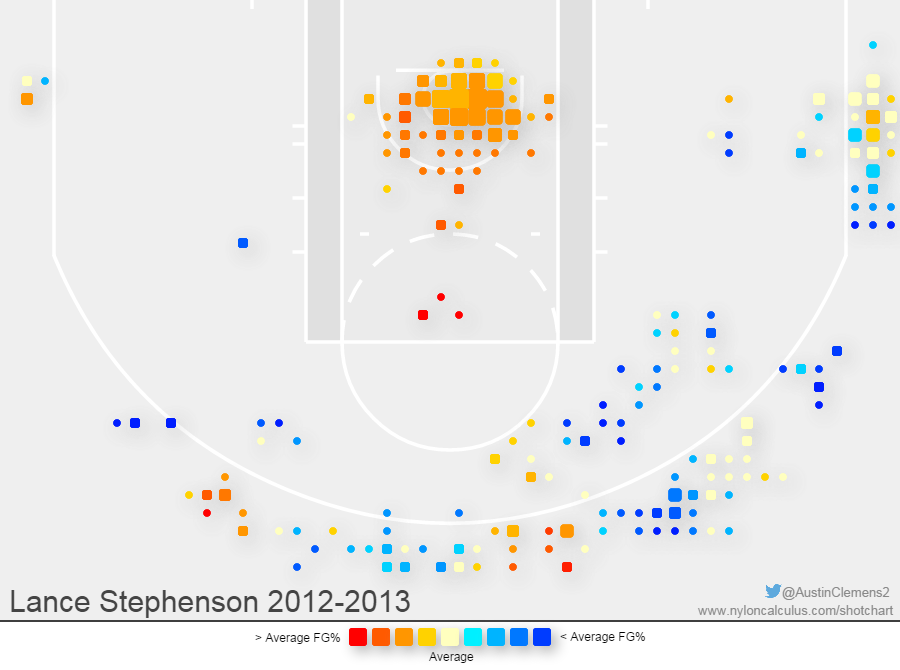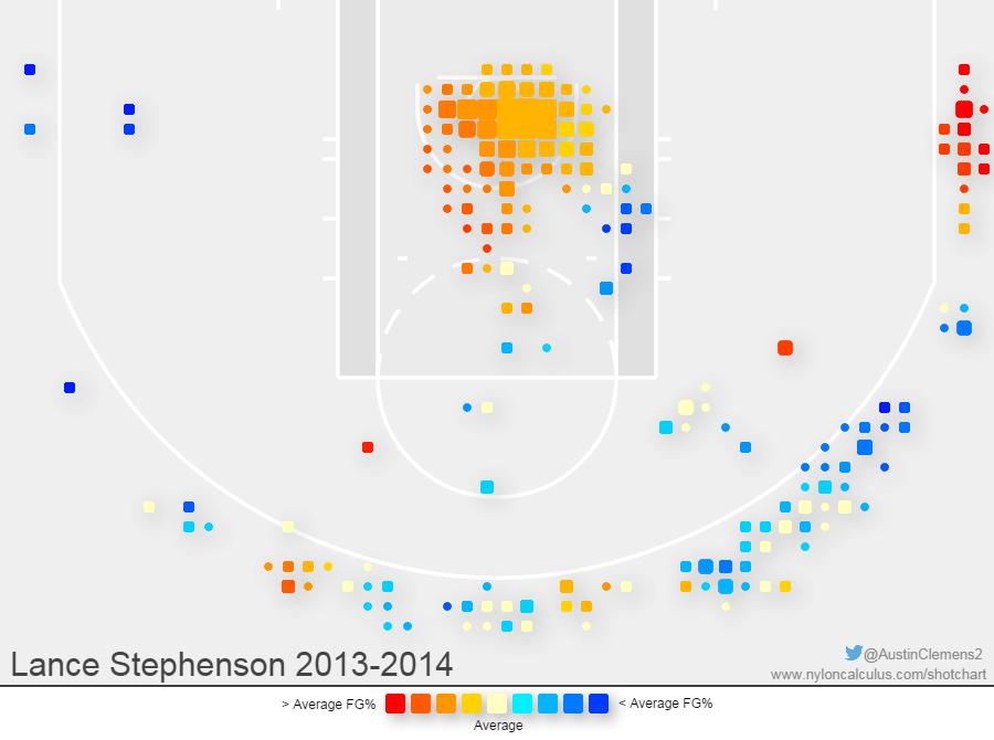 It was in his third season in the NBA that Lance Stephenson would finally see sustained minutes. In the wake of leading-scorer Danny Granger’s left knee injury Lance would start 72 games and average under 30 minutes a contest as the starting shooting guard, scoring 8.8 points, 3.9 rebounds, and 2.9 assists per game, and moving breakout-star Paul George to Granger’s small forward spot. The Pacers finished with the third seed in the 2013 Eastern Conference playoffs and led the league in defensive rating (points allowed per 100 possessions), but fell from 7th in offensive rating to 20th without Granger. Stephenson made strides shooting the ball, but would submit his finest season of his four-year career in 2013-14.